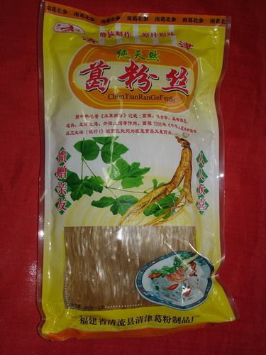 本品以葛根为原料,采用现代工艺精制而成,不加任何添加剂,纯天然绿色食品。该产品具有色泽透明,弹性好,味美可口,久煮不糊,营养丰富,是人们日常降压降脂降火的首选功能食品,对人体心脑血管、微循环能起明显的调理作用。