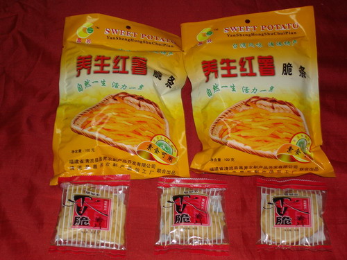 本品系闽西特产,采用素有“闽西八大干”美称的红心地瓜干,经传统工艺精制而成,不掺任何色素和添加剂,含有丰富的维生素A、C、D、蛋白质和微量元素钙、磷、铁等成分。长年食用,有促进新陈代谢、健美面部肌肤的功效。是现代人旅游、休闲食品的消费需求。