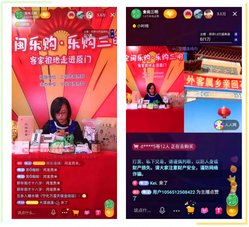 12月5-6日,“全闽乐购 乐购三明”寻找泰味、客家祖地走进厦门五缘湾。通过线下实物展销+线上直播带货的方式为厦门市民和游客推介泰宁、宁化的农特产品和美景。线上直播活动中,网络达人和企业、商家向广大网友和粉丝推荐泰宁特色产品和美景,现场还设计截屏赠送门票和特产的环节,吸引众多网友为泰宁、宁化打call,线上直播累计观看量超57万人。