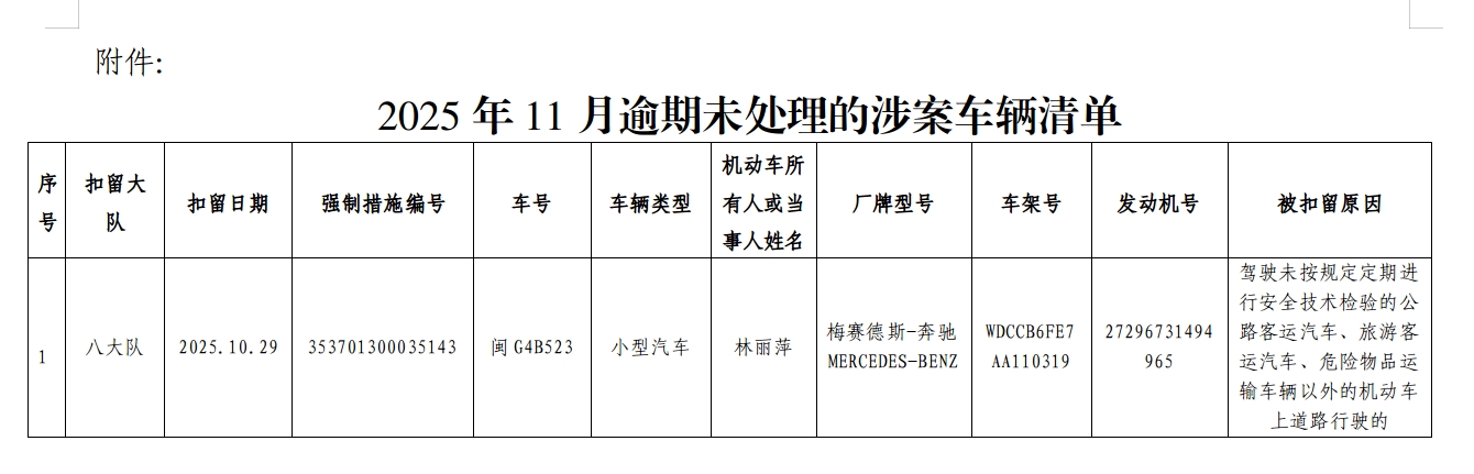 下列1辆机动车因交通违法被我队下属大队依法扣留,车辆驾驶人或者所有人、管理人逾期未前来处理,根据《中华人民共和国道路交通安全法》第一百一十二条第三款和《中华人民共和国道路交通安全法实施条例》第一百零七条之规定,请自本公告发布之日起三个月内到相关大队接受处理。经公告三个月仍不前来接受处理的,我队将对扣留的车辆依法处理。