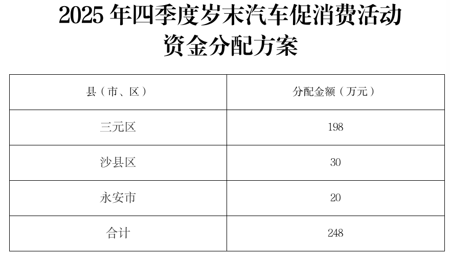 根据《福建省商务厅 福建省财政厅关于开展2025年岁末汽车促消费补贴活动的通知》(闽商务〔2025〕193号)、《福建省商务厅 福建省财政厅关于下达2025年中央外经贸发展专项资金(第三批)和省级商务发展专项资金(第五批)的通知》(闽财外指〔2025〕19号)文件精神,为进一步提振我市汽车消费市场活力,经三元区商务局、沙县区商务局、永安市工信局申请,并上报活动实施方案,市商务局党组会议研究通过,拟下达2025年四季度岁末汽车促消费活动资金248万元。现予以公示,如有异议,请于公示截止日期前向市商务局以书面形式反馈。