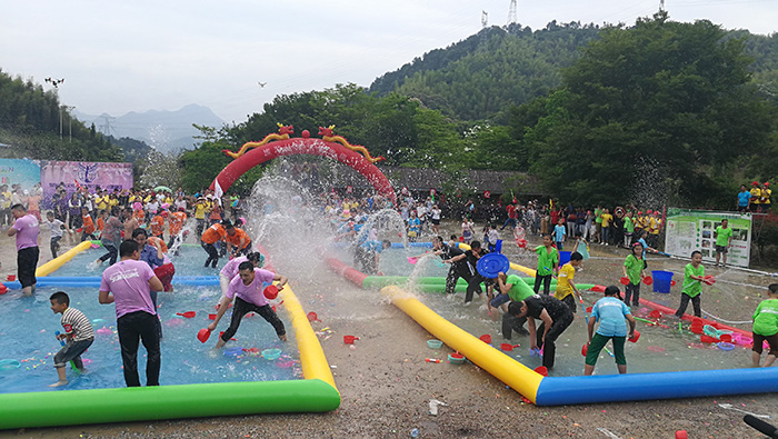 现场游客分为十队,用现场配备的水枪、水桶、水球及水管参加大战,嗨翻全场,将活动气氛推至高潮。