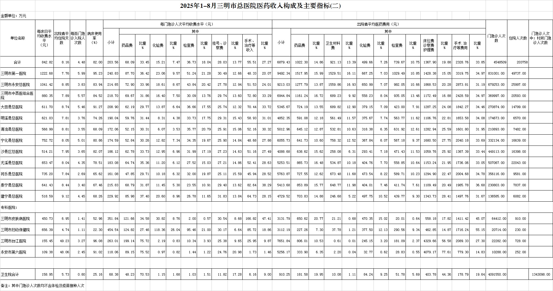 (一)1-8月份12家总医院运行情况:医药总收入253281.59万元,比去年同期261994.74万元减少8713.16万元,下降3.33%(不含体检、疫苗接种和结算差额等收入的医药收入为207808.79万元,比去年同期230487.13万元,减少22678.34万元,下降9.84%)。其中:医疗服务性收入130201.34万元,占医药收入51.41%(床位收入6853.41万元、手术治疗护理等服务收入108117.00万元、结算差额15230.93万元),比去年同期123253.34万元,医疗服务性收入增加6948.01万元,增长5.64%;检查化验收入49830.98万元,占医药收入19.67%,同比下降15.30%;药品收入52585.15万元,药占比20.76%,分别比去年同期下降8.04%、下降1.06个百分点;卫生材料收入20664.12万元(其中高值耗材收入10503.23万元),占医药总收入8.16%,比去年同期8.68%,下降0.52个百分点。入院人次203758人次,比去年同期224923人次,减少21165人次,下降9.41%;门急诊人次4548509人次,比去年同期4554744人次,减少6235人次,下降0.14%;每门诊次均费用203.56元,比去年同期209.29元,减少5.73元,下降2.74%;出院者平均费用6879.43元,比去年同期6651.68元,增加227.75元,增长3.42%。