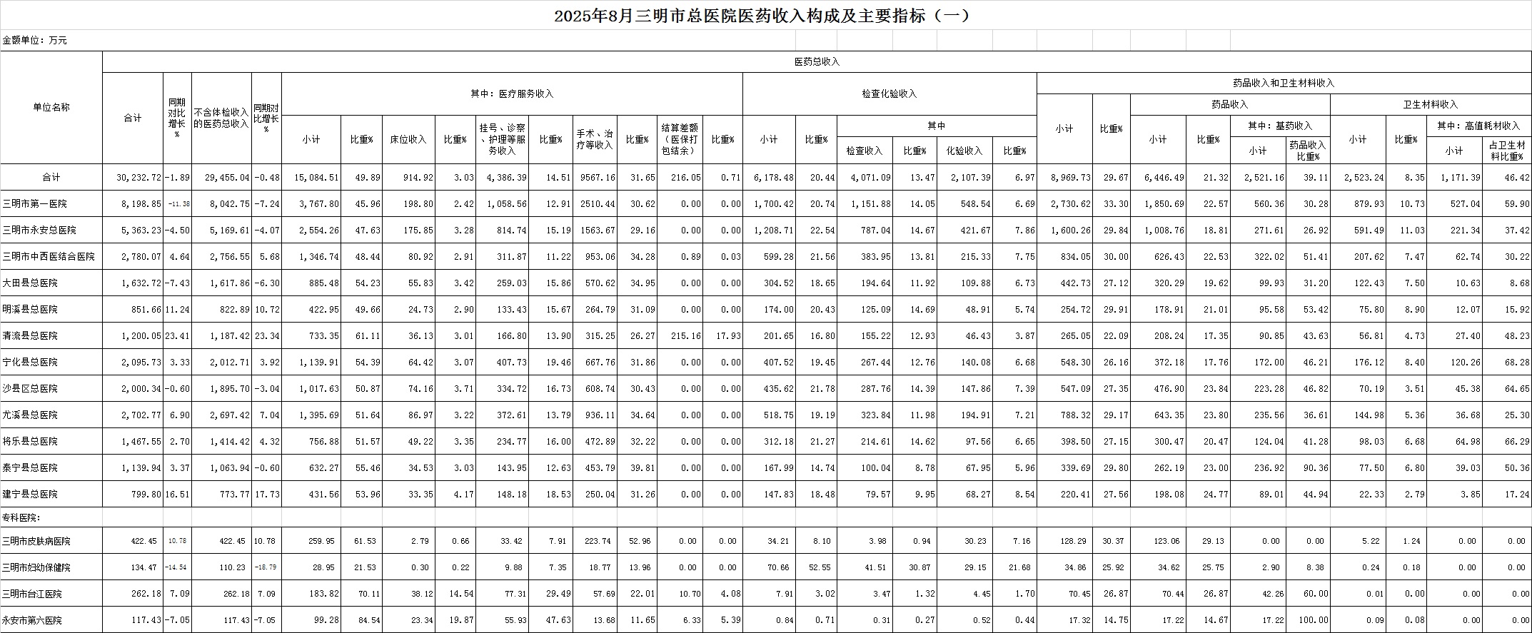 医药总收入。1-8月份12家总医院医药总收入同比下降3.33%(不含体检、疫苗接种和结算差额等收入的医药收入同比增长9.84%),增长率超过考核要求(三级医院考核要求为10%,二级医院考核要求为8%)的有1家总医院,其中将乐县总医院同比增长8.01%。