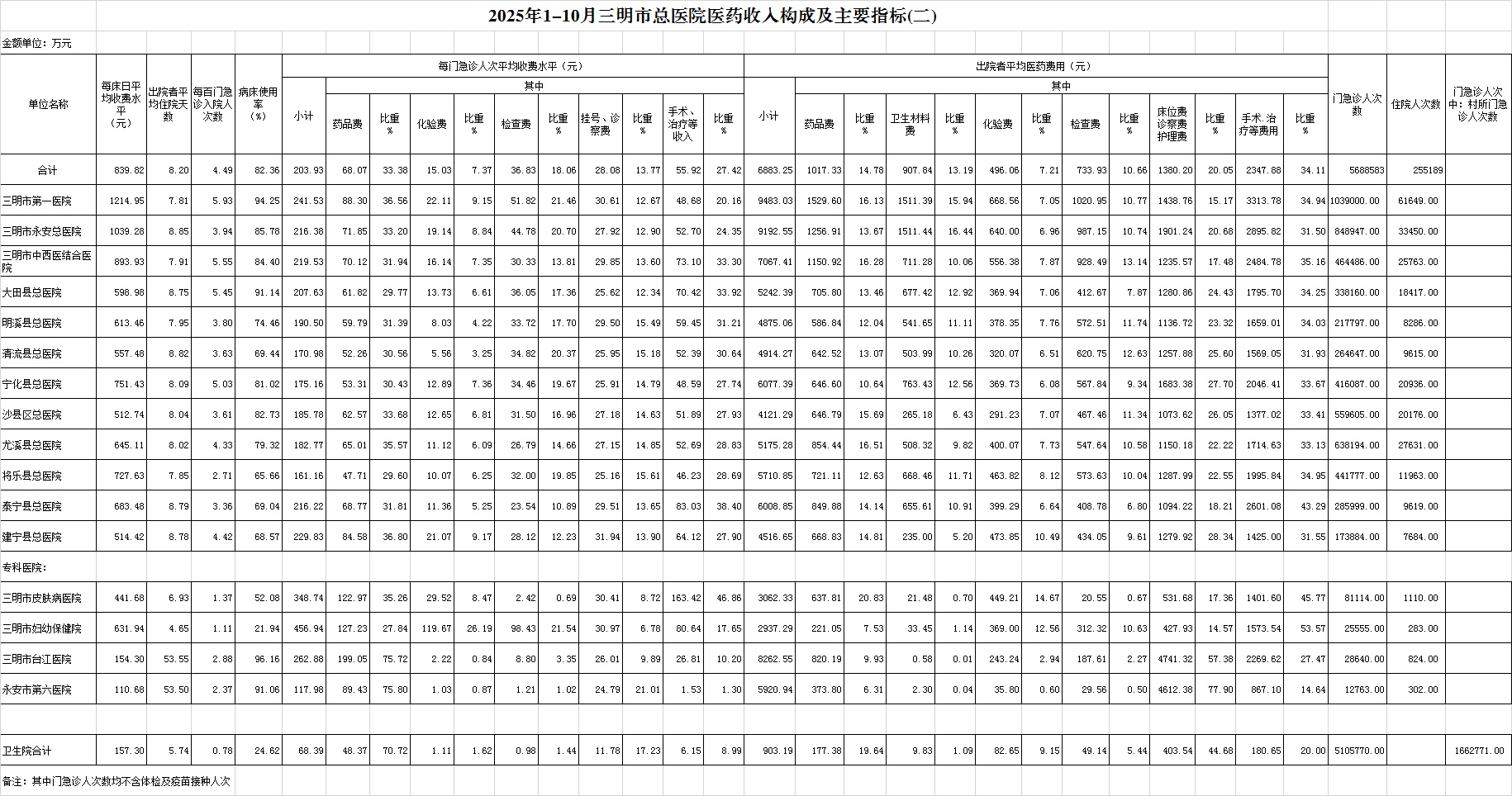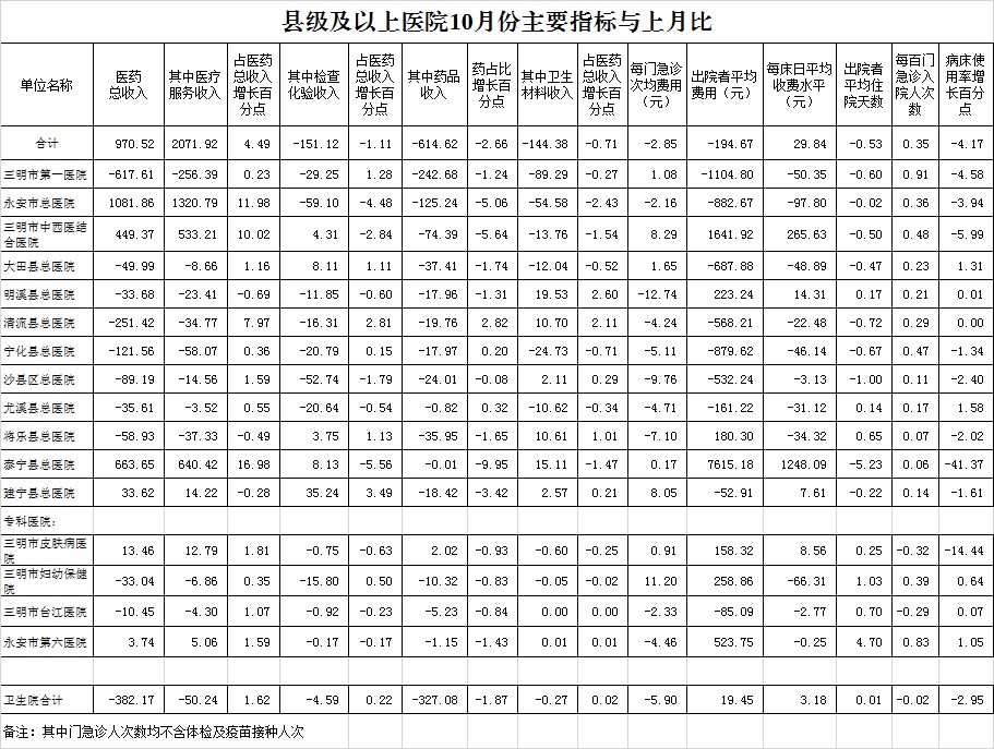(一)1-10月份12家总医院运行情况:医药总收入314909.61万元,比去年同期322728.16万元减少7818.54万元,下降2.42%(不含体检、疫苗接种和结算差额等收入的医药收入为259329.93万元,比去年同期279817.9万元,减少20487.97万元,下降7.32%)。其中:医疗服务收入161843.82万元,占医药收入51.39%(床位收入8623.48万元、手术治疗护理等服务收入136168.14万元、结算差额17052.21万元),比去年同期153153.64万元,医疗服务收入增加8690.19万元,增长5.67%;检查化验收入61995.92万元,占医药收入19.69%,同比下降13.49%;药品收入65597.45万元,药占比20.83%,分别比去年同期下降6.58%、下降0.93个百分点;卫生材料收入25472.41万元(其中高值耗材收入12744.21万元),占医药总收入8.09%,比去年同期8.58%,下降0.49个百分点。入院人次255189人次,比去年同期272444人次,减少17255人次,下降6.33%;门急诊人次5688583人次,比去年同期5650918人次,增加37665人次,增长0.67%;每门诊次均费用203.93元,比去年同期209.66元,减少5.74元,下降2.74%;出院者平均费用6883.25元,比去年同期6825.24元,增加58.01元,增长0.85%。