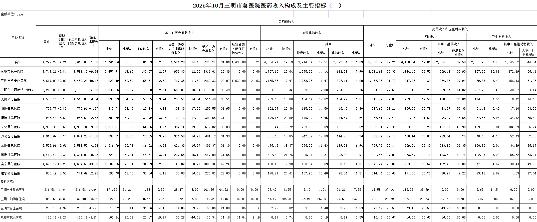 医疗服务收入占比。1-10月份12家总医院医疗服务收入占医药总收入51.39%,其中:市第一医院47.10%、三明市永安总医院50.68%、市中西医结合医院54.09%、大田县总医院57.11%、明溪县总医院51.43%、清流县总医院53.64%、宁化县总医院57.59%、沙县总医院50.26%、尤溪县总医院49.58%、将乐县总医院54.37%、泰宁县总医院57.81%、建宁县总医院53.02%,所有总医院均完成了考核指标。